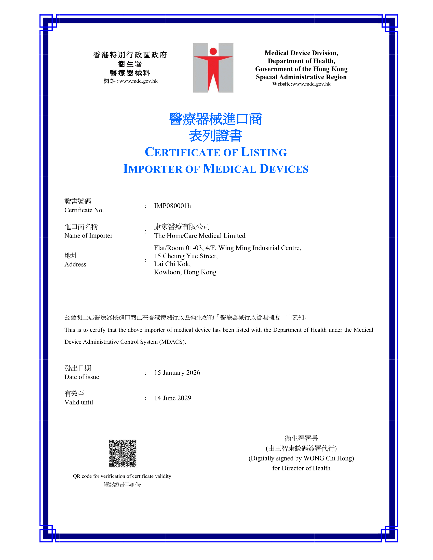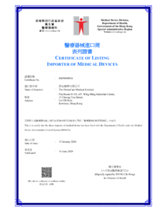 「康家醫療有限公司」已成功獲取衞生署的醫療儀器進口商表列證書(證書號碼: IMP080001)*。下列醫療儀器產品製造商DeVilbiss Healthcare, Hoffrichter GmbH, SOMNOmedics GmbH, TNI Medical, Nonin Medical 及 Restech委任本公司為本地負責人,並已為此醫療儀器產品從衞生署屬下醫療儀器科獲取醫療儀器表列證書。